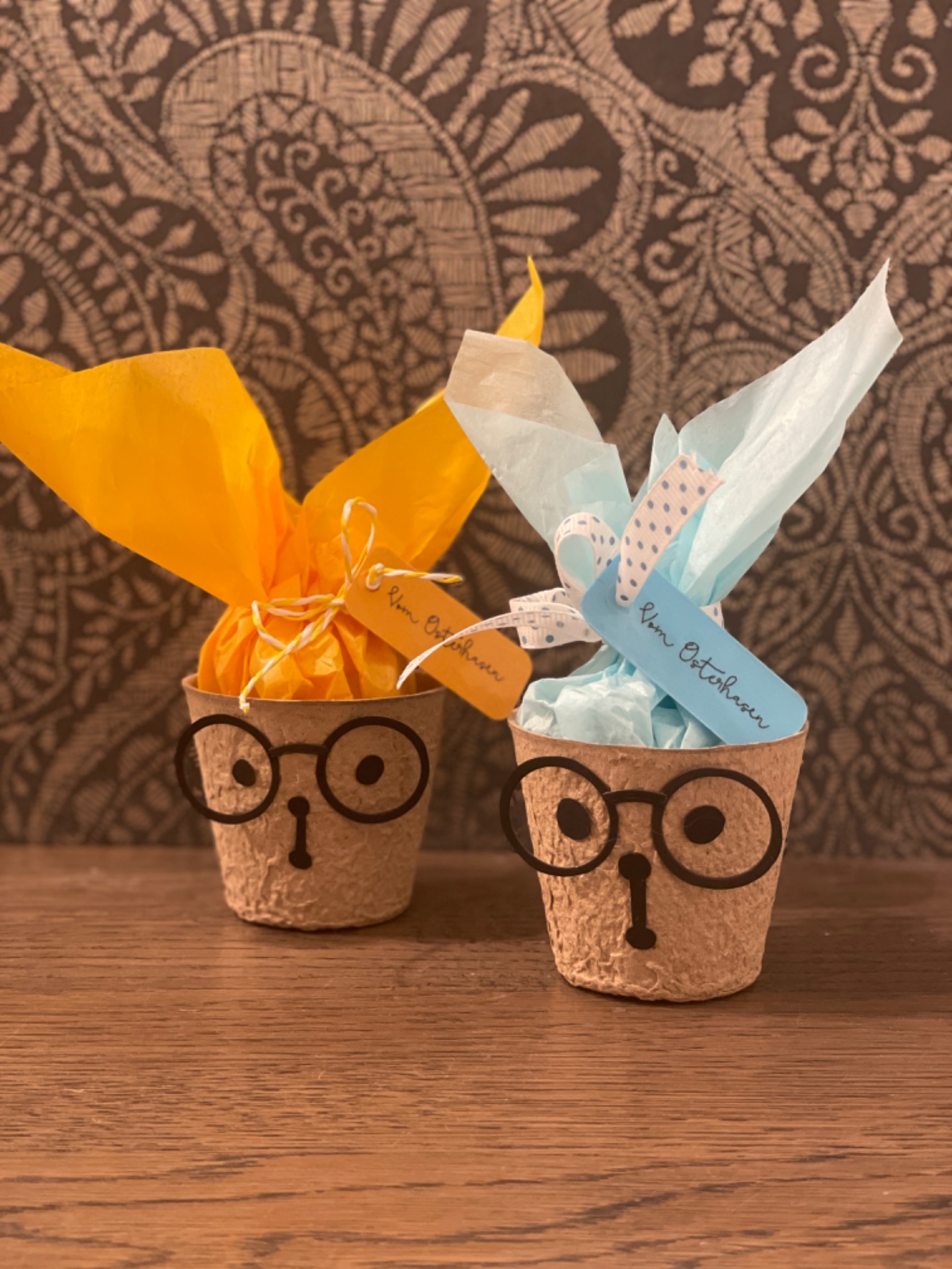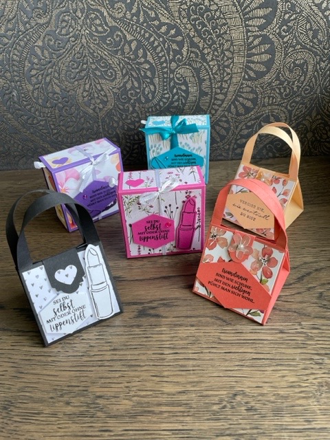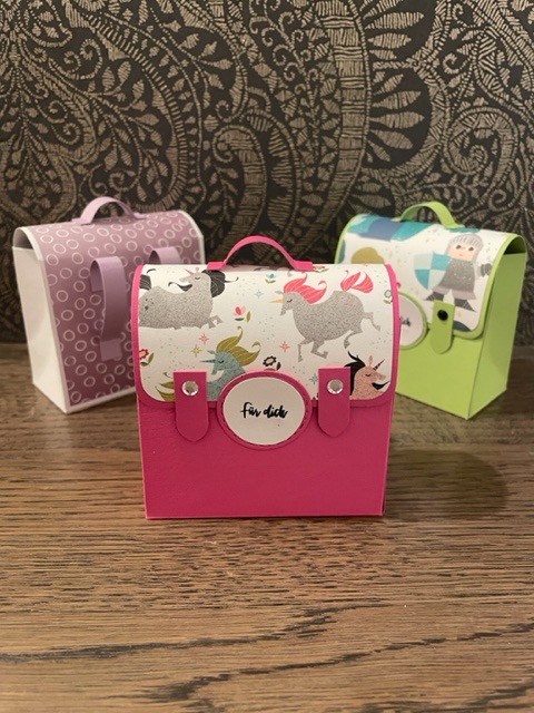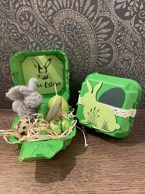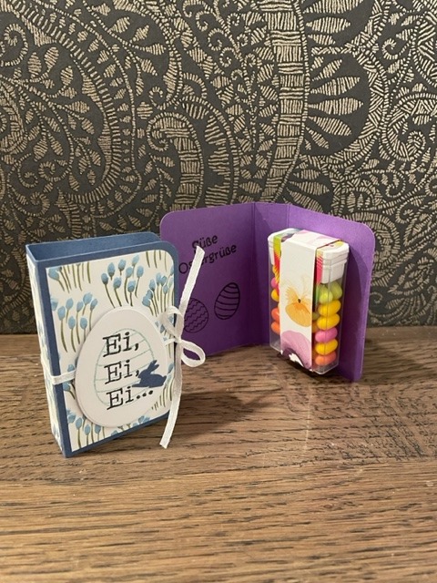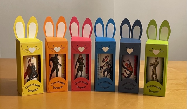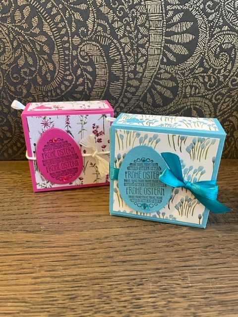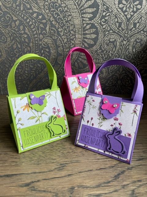 Fröhlich bunte Taschen mit Schokofüllung und Magnetverschluss und österliche Schwenkboxen (auch alternativ vegan mit KoRo-Snackkugel)